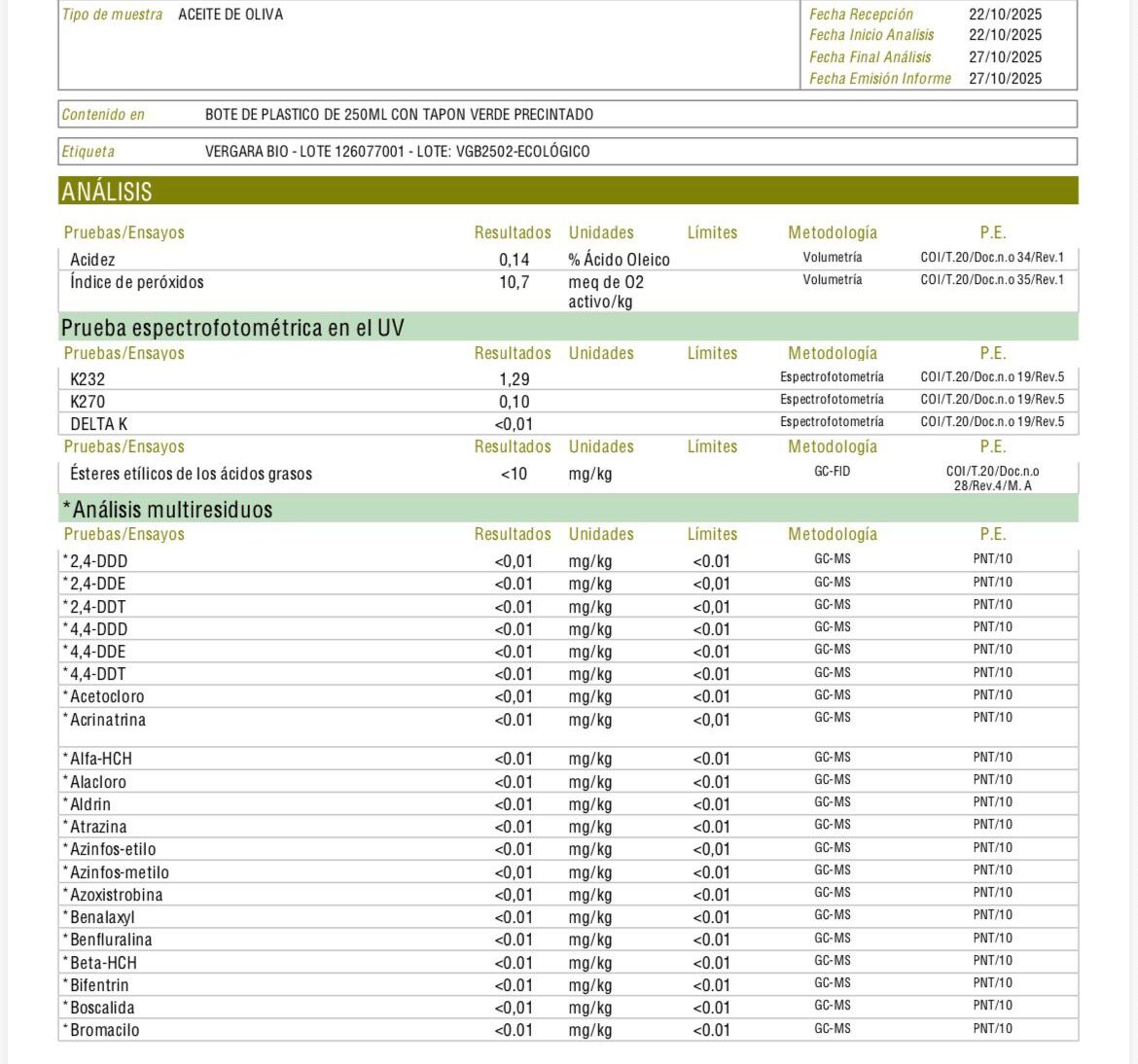 Venta Vieja õli jaoks on oliivid korjatud ja õliks pressitud detsembris 2025.a ning selle värvus on kuldse ja rohelise vahepealne, mis võiks sobida nii rohelise kui ka kuldse õli austajatele! Täpse värvuse näed ära kõrvalolevast videost. BioVergara õli jaoks on oliivid korjatud oktoobris ning õli värvus on roheline ning maitse intensiivsem. Bio Vergara õli happelisus on laboraatorsete analüüside põhjal erakordselt madal, vaid 0,14 %. Detsembris pressitud õli laboratoorsed analüüsid saabusid ka äsja ning tulemus on ülihea, happelisus on 0,18% (eelmine aasta oli see 0,22%, mis on ka väga madal).
